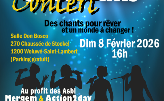 Quatre formidables chorales au style dynamique, original et varié : Barberpeis, Clever Kitsch, La Balladine Éphémère et Ribambelge Dimanche 8 février 2026 à 16 h Au profit de deux asbl : « Mergem », qui fêtera ses 25 ans, vient en aide aux jeunes et aux plus démunis en Roumanie. Et « Action2day », […]